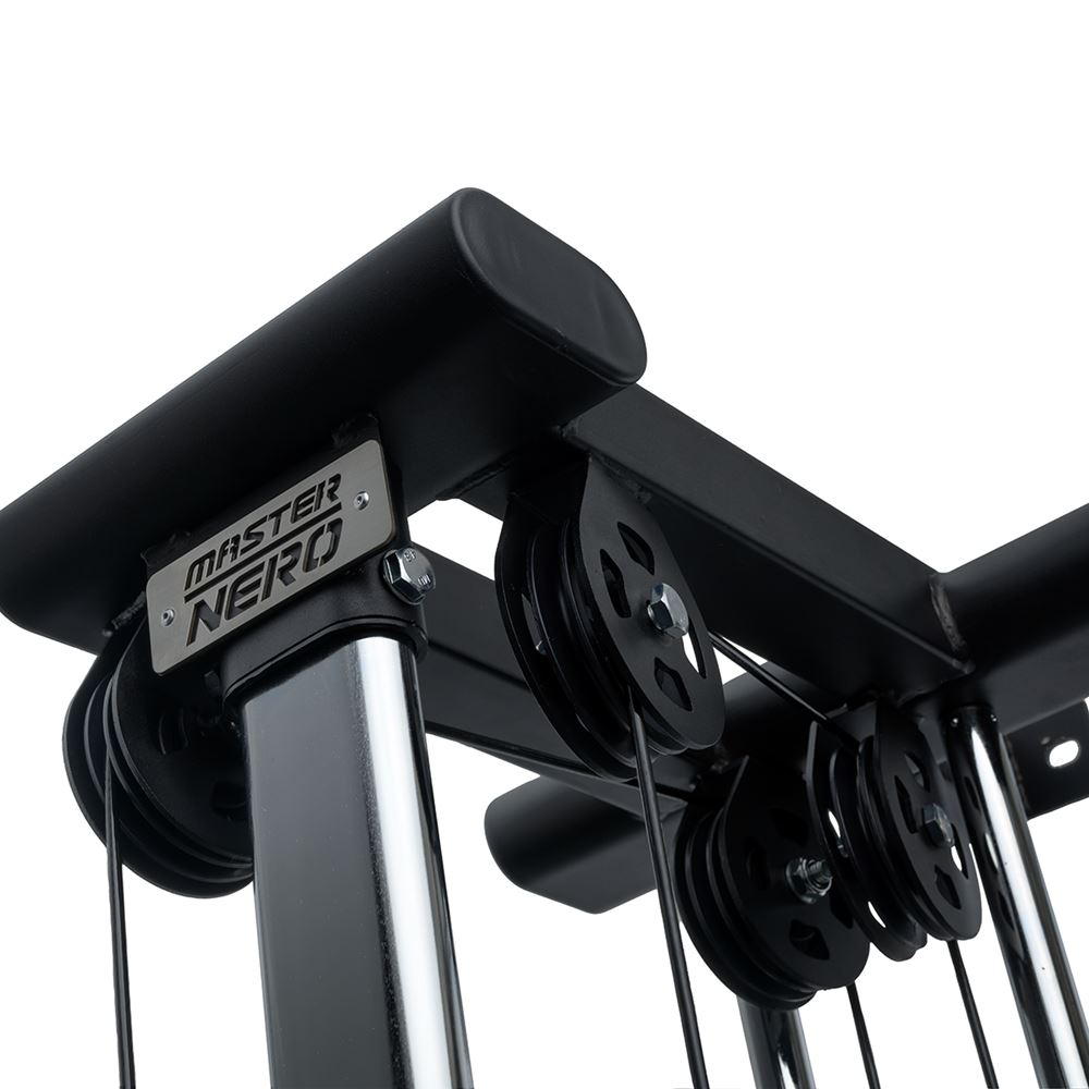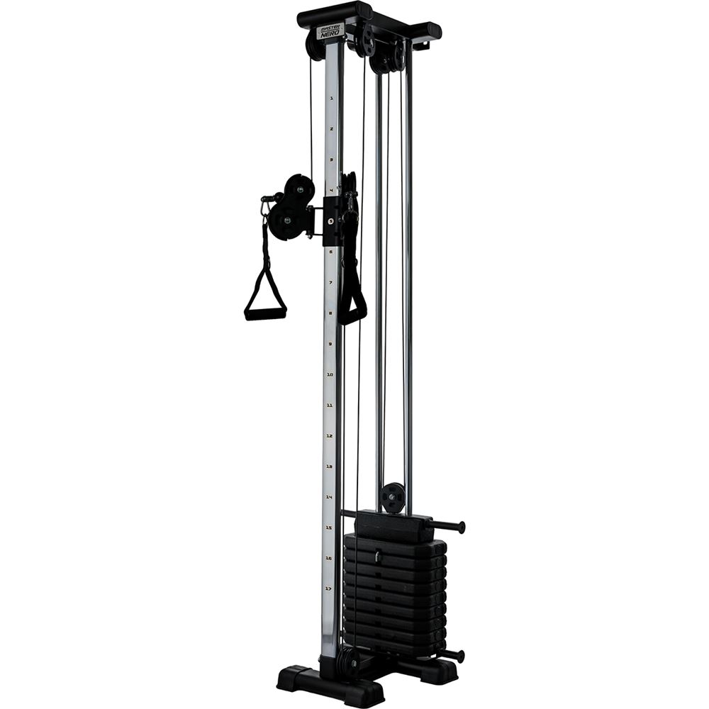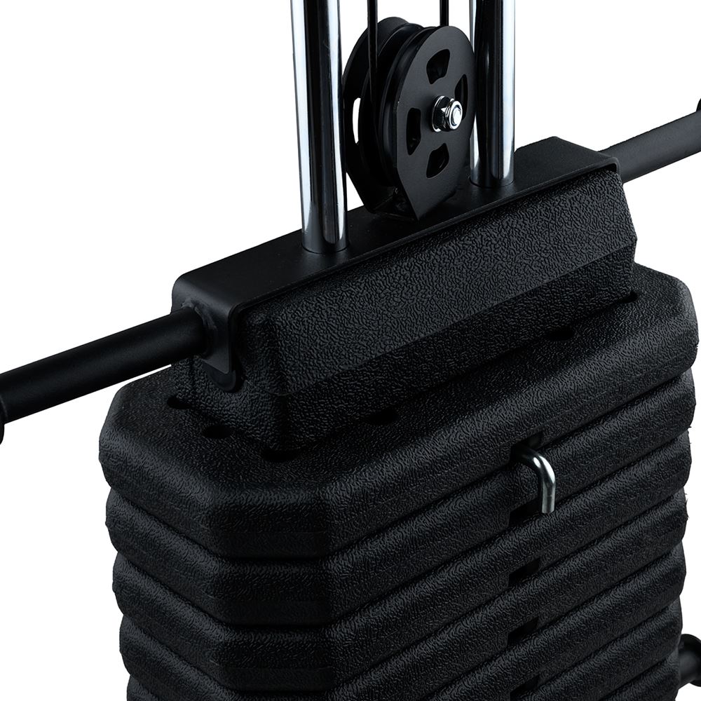 Maskinen er udstyret med et vægtmagasin på 50 kg, og den har dobbelte håndtag, hvilket giver mulighed for at vælge, om man vil træne med et enkelt håndtag og få en udveksling på 1:2, eller forbinde begge kabler til det samme trækgreb og få en udveksling på 1:1.